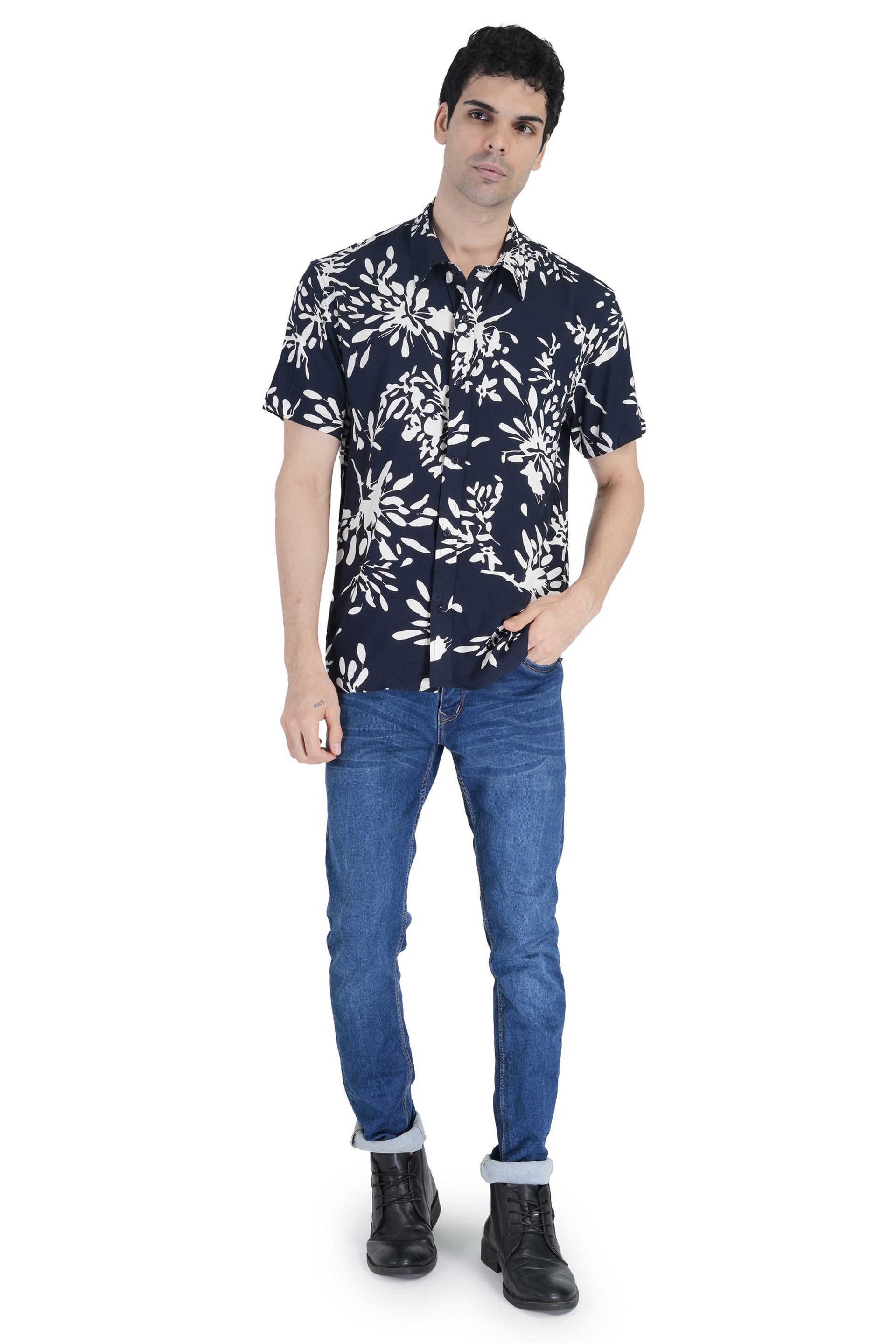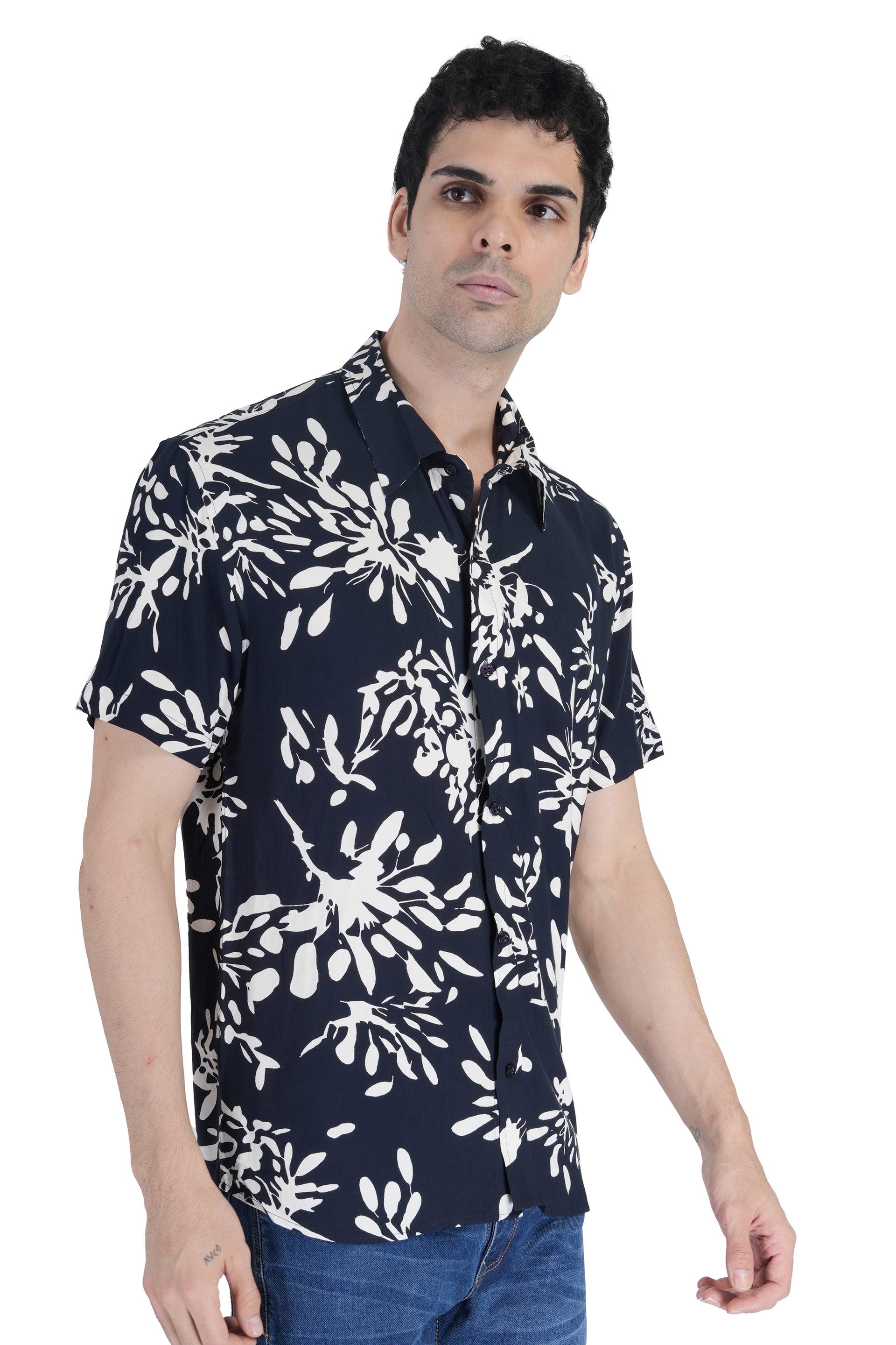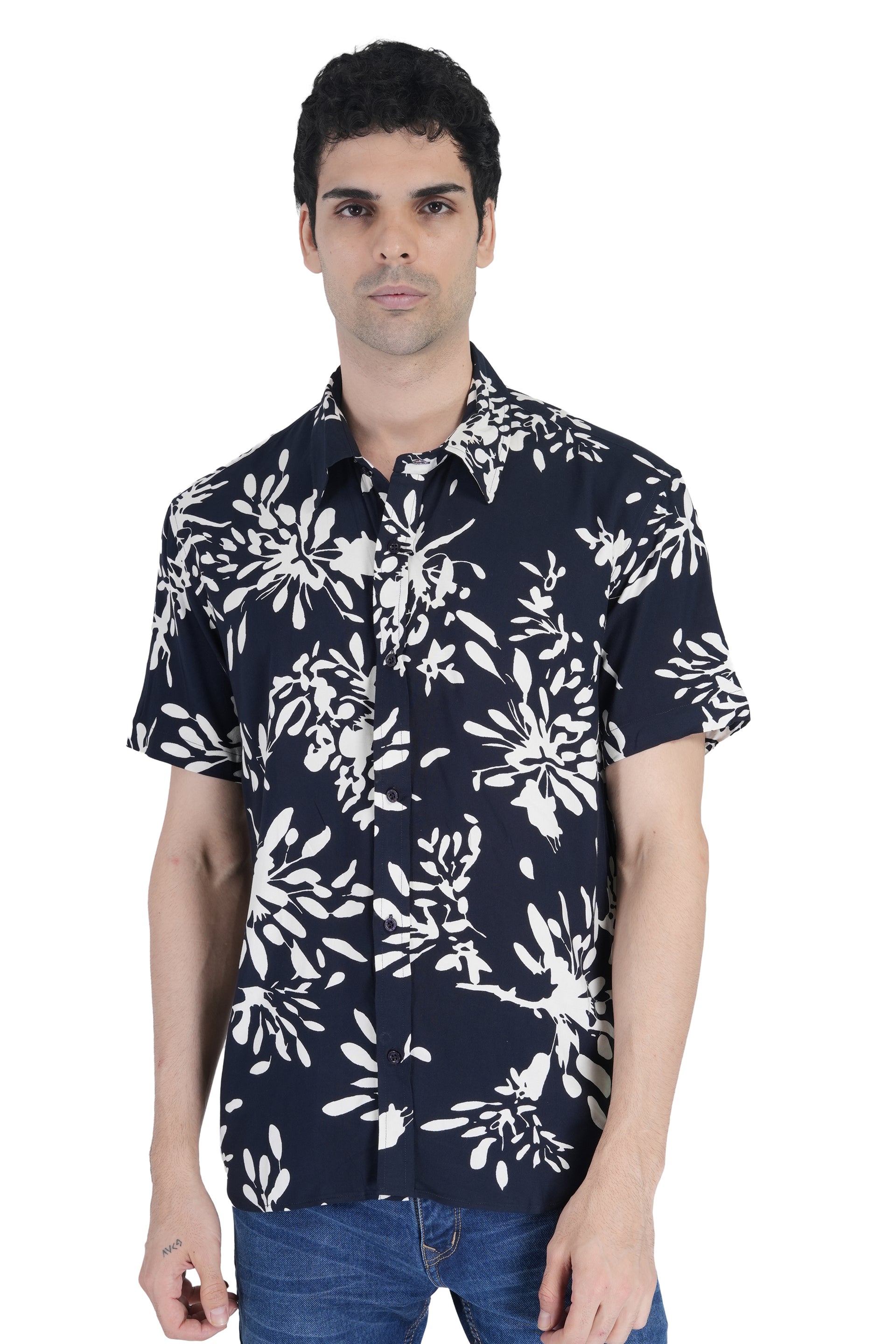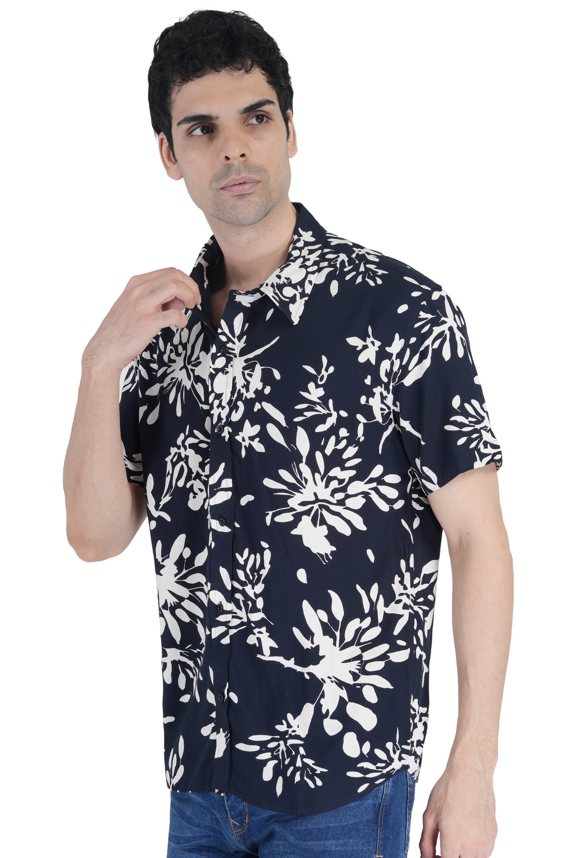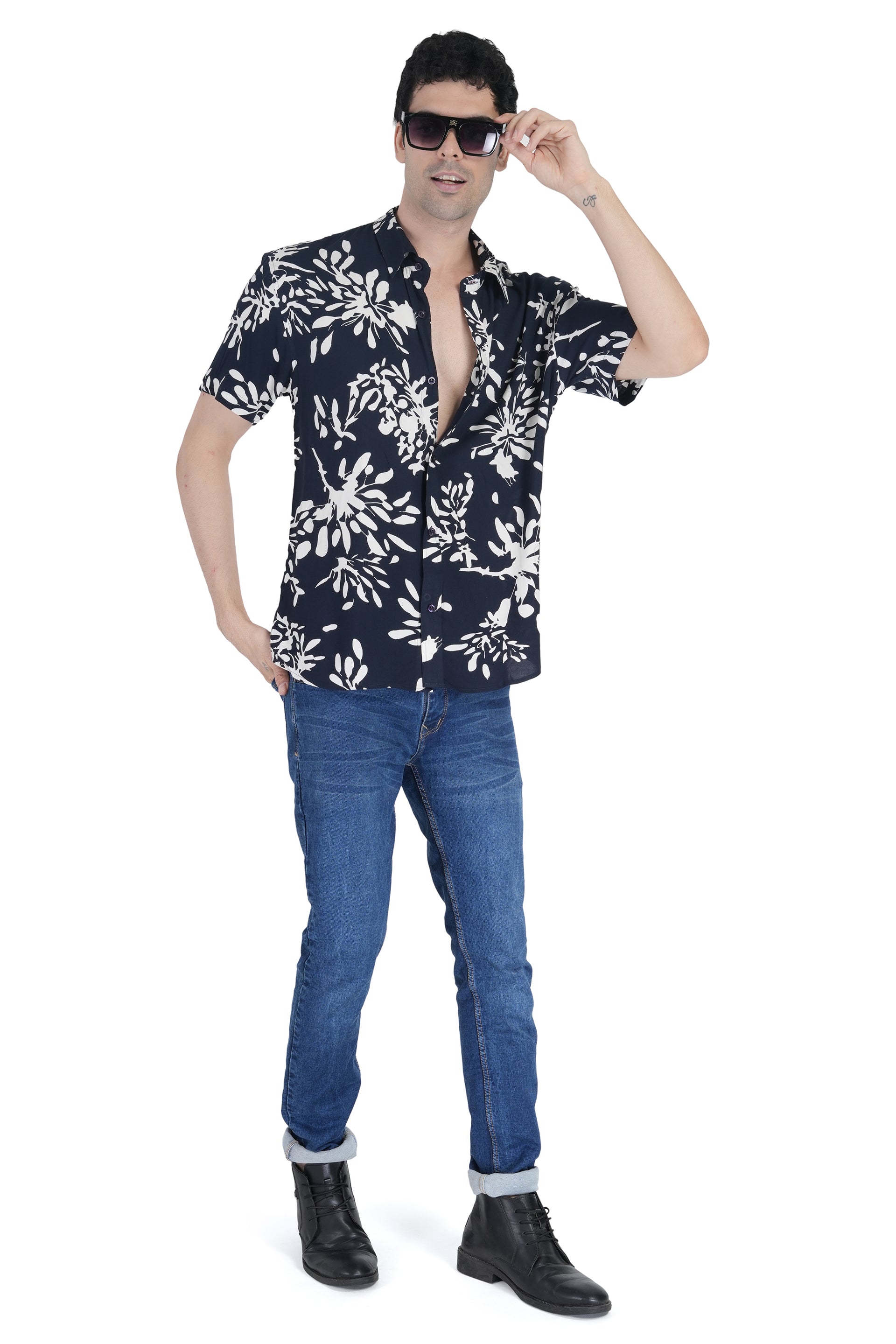 Men's Black Standard Floral Printed Spread Collar Casual Shirt