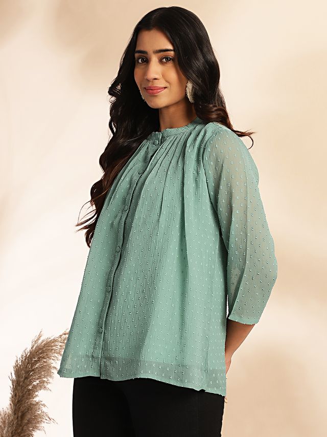 Discover understated elegance with the Kinnko Sage Dobby Chiffon Woven Design Regular Top. Crafted from airy dobby chiffon, this top features a serene sage hue and a unique woven design that adds a touch of texture and sophistication. The regular fit ensures a comfortable and flattering silhouette, ideal for both casual and semi-formal occasions. The lightweight fabric drapes beautifully, providing a chic, flowing effect. Pair this versatile top with your favorite trousers or skirts for a refined look that seamlessly combines modern style with classic charm. Elevate your wardrobe with Kinnko’s exquisite woven chiffon top.